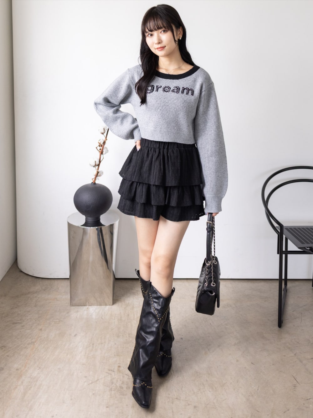 グレーニットにフリルショーパンを合わせた甘辛ミックスコーデ