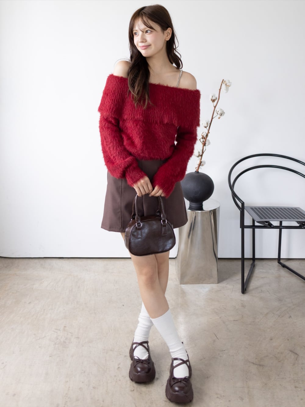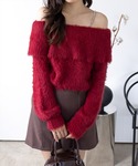 レッドオフショルニットにブラウンスカートを合わせた 大人可愛いコーデ