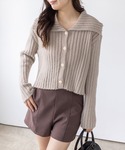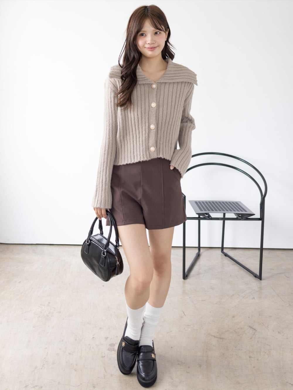 ベージュカーデとブラウンショーパンのシンプル上品コーデ