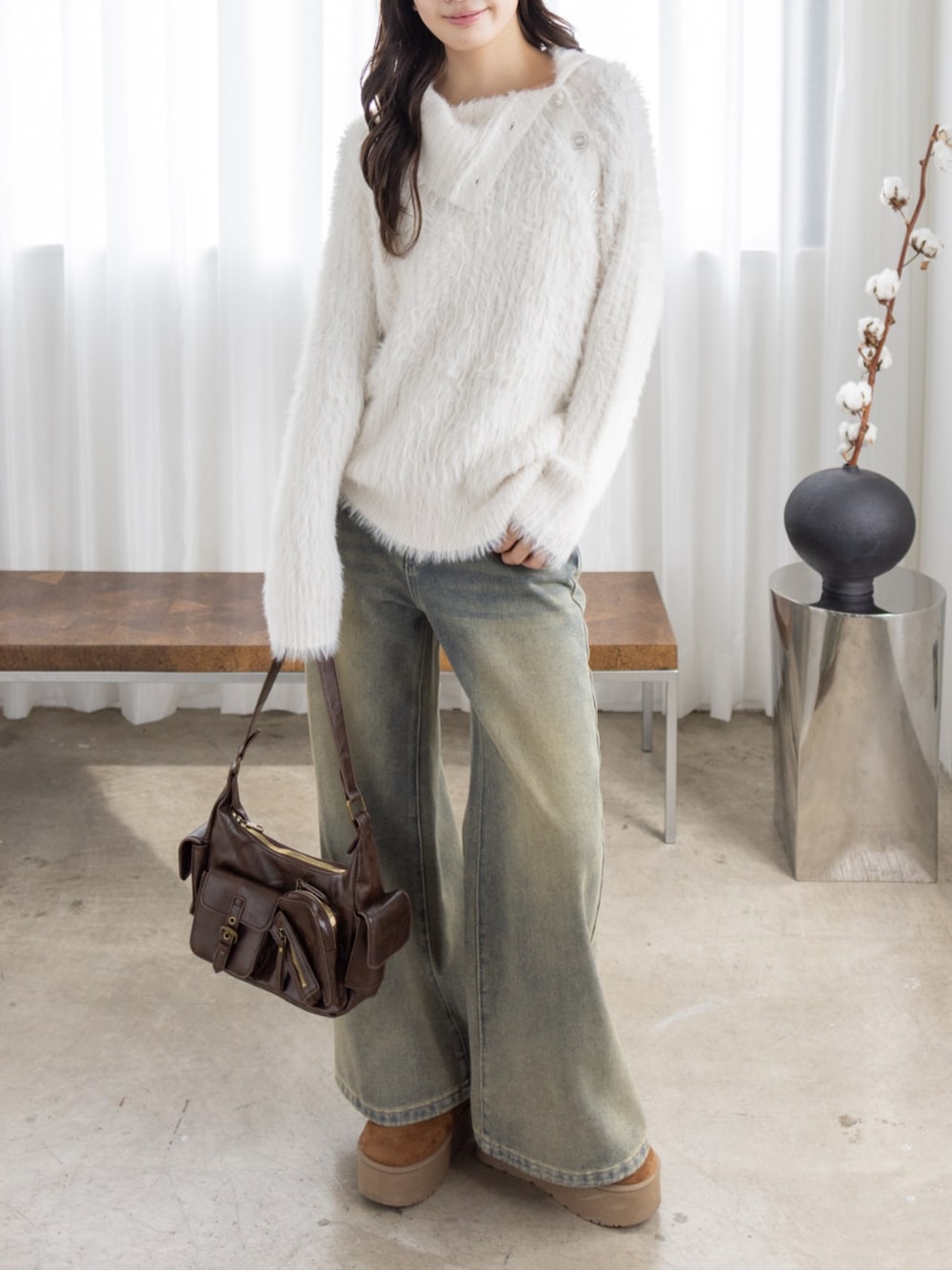白ふわニットとワイドデニムのリラックスカジュアルコーデ