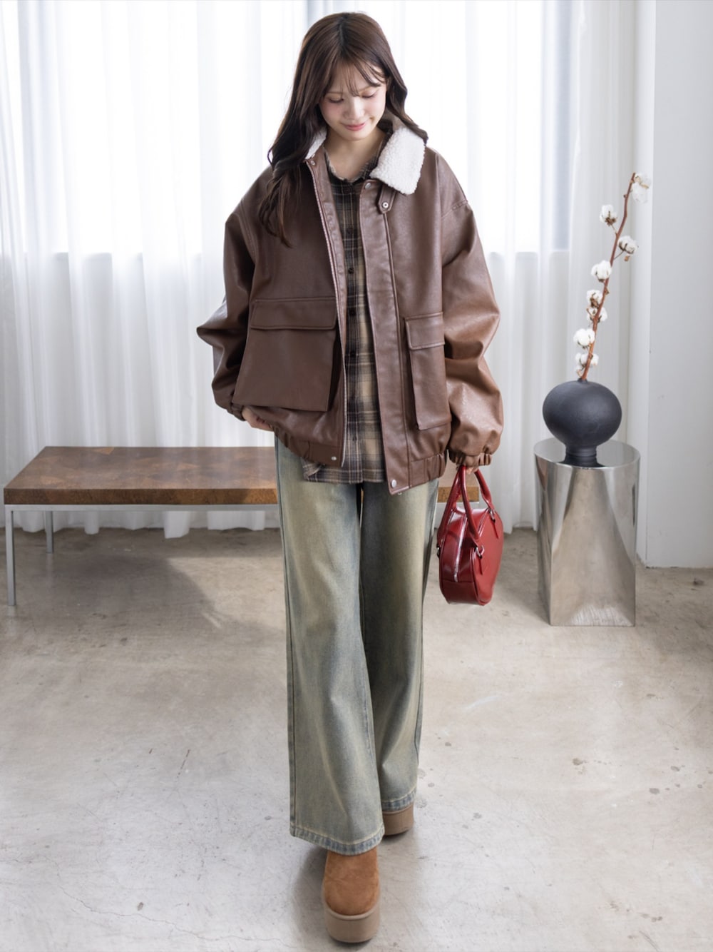 ブラウンレザーとチェックシャツのカジュアルレトロコーデ