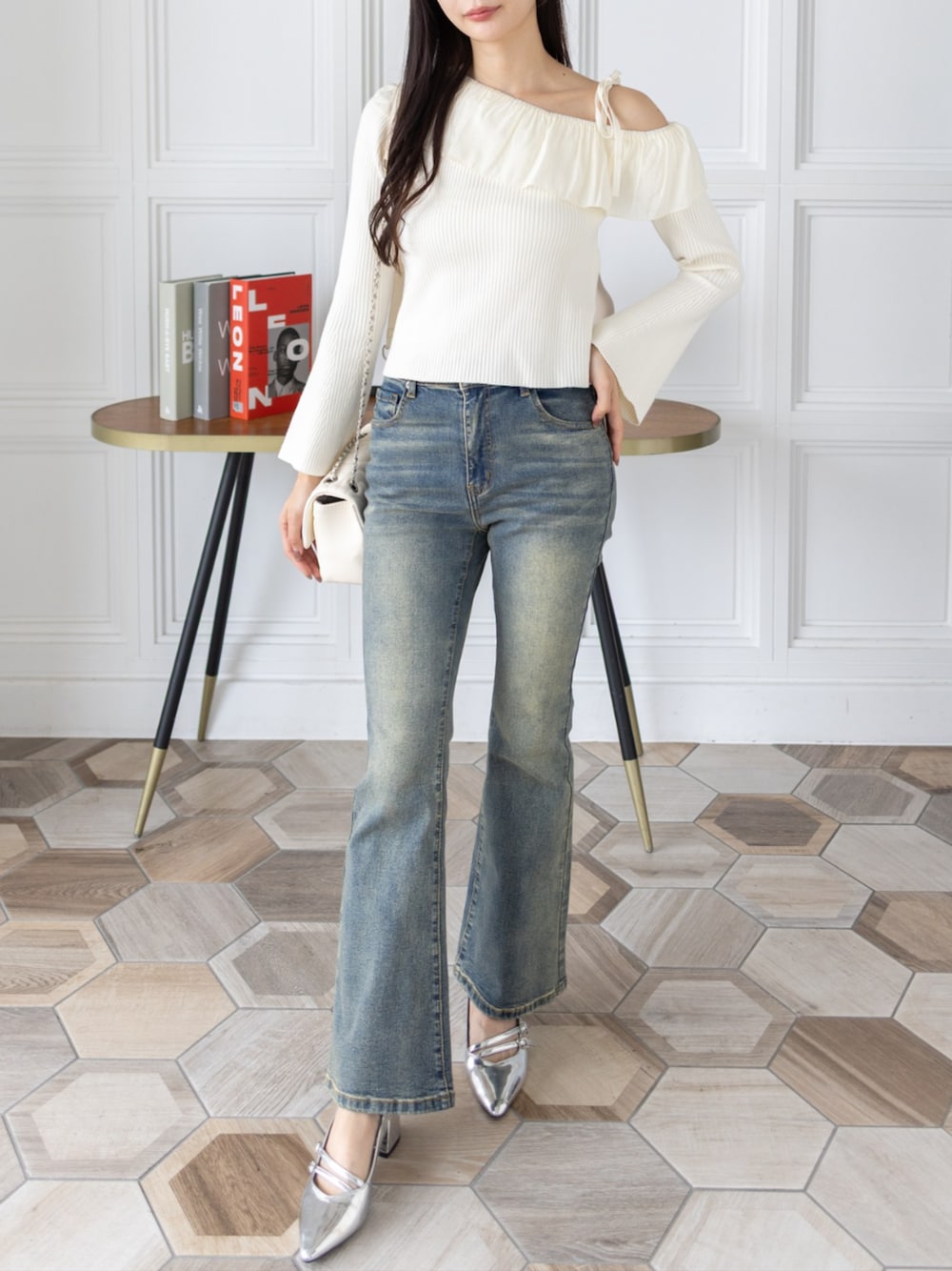 ワンショルダーフリルトップス×デニムの抜け感フェミカジュコーデ