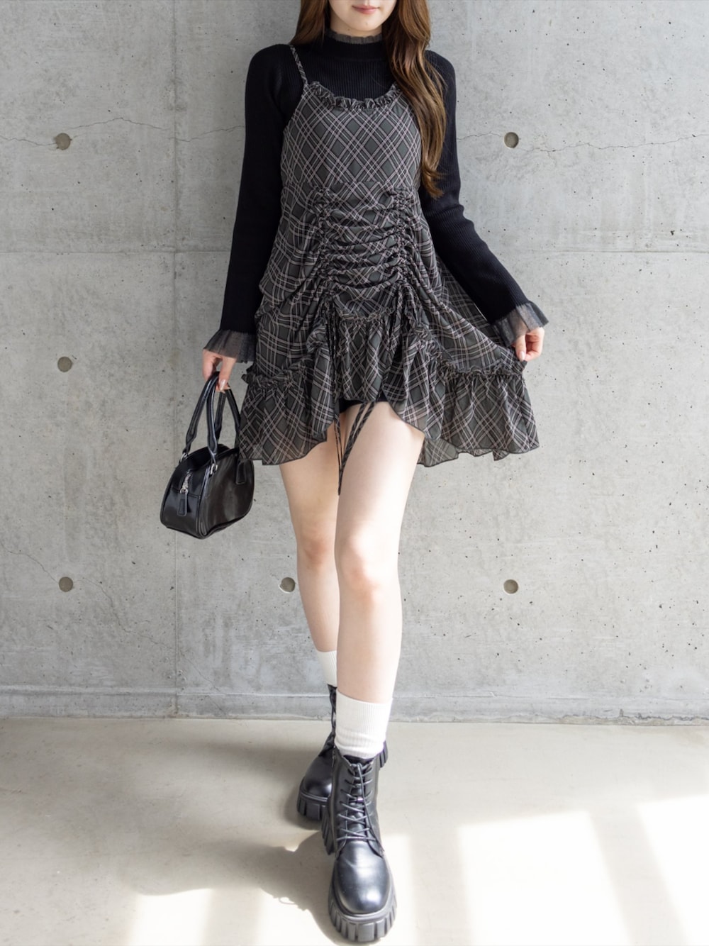 ドロストワンピに厚底ブーツを合わせたガーリーだけど エッジの効いたコーデ