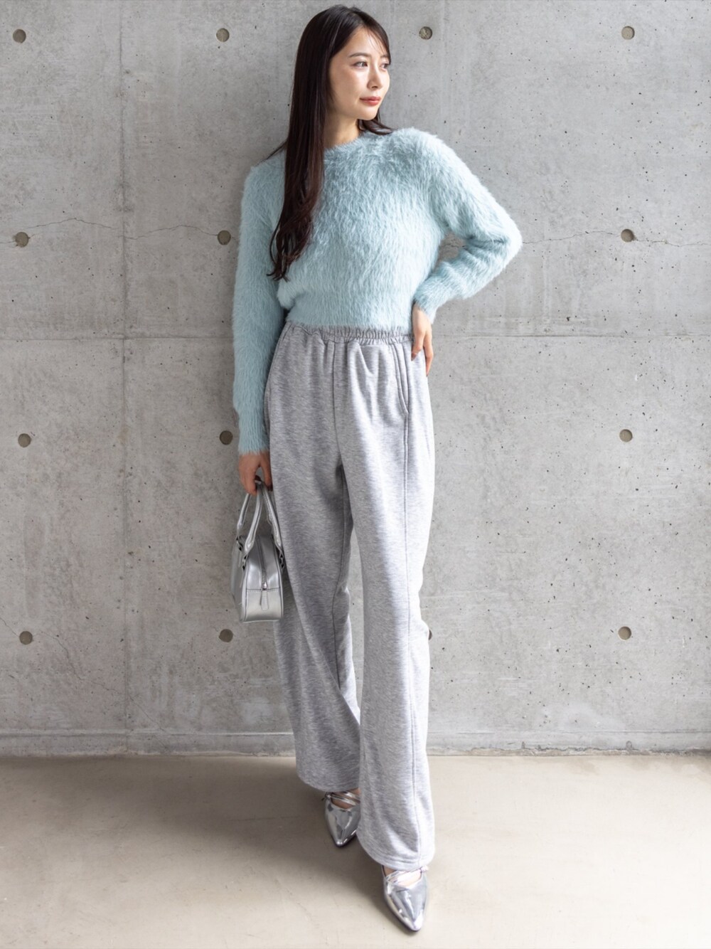 ふわふわニットにスウェットパンツを合わせた 抜け感のあるラフかわコーデ