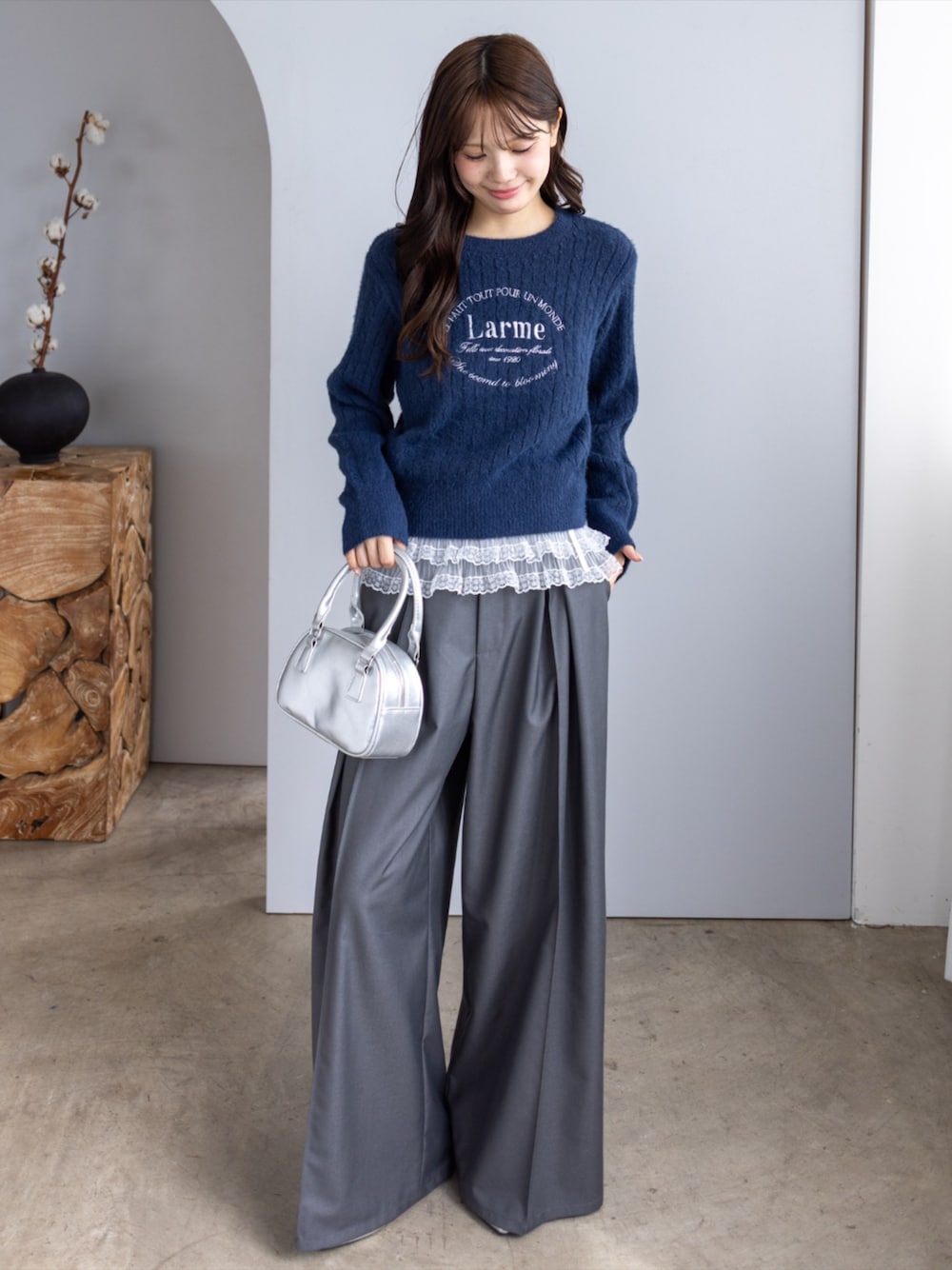 レースインナーを覗かせたゆるニット×ワイドパンツで 甘すぎない大人フェミニンコーデ