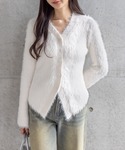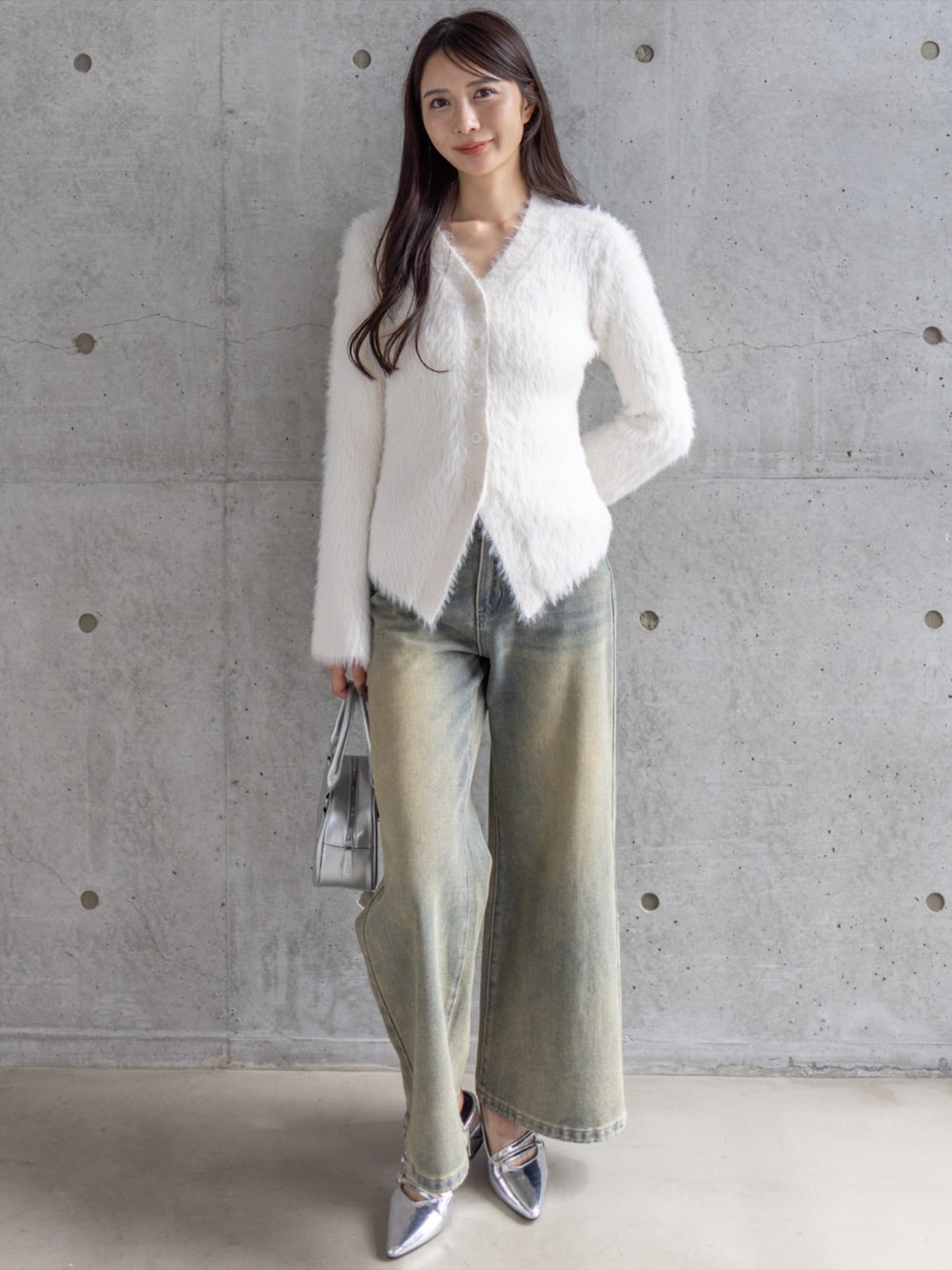 シャギーカーディガンにワイドデニムを合わせた シンプルだけど今っぽい抜け感コーデ