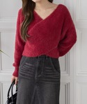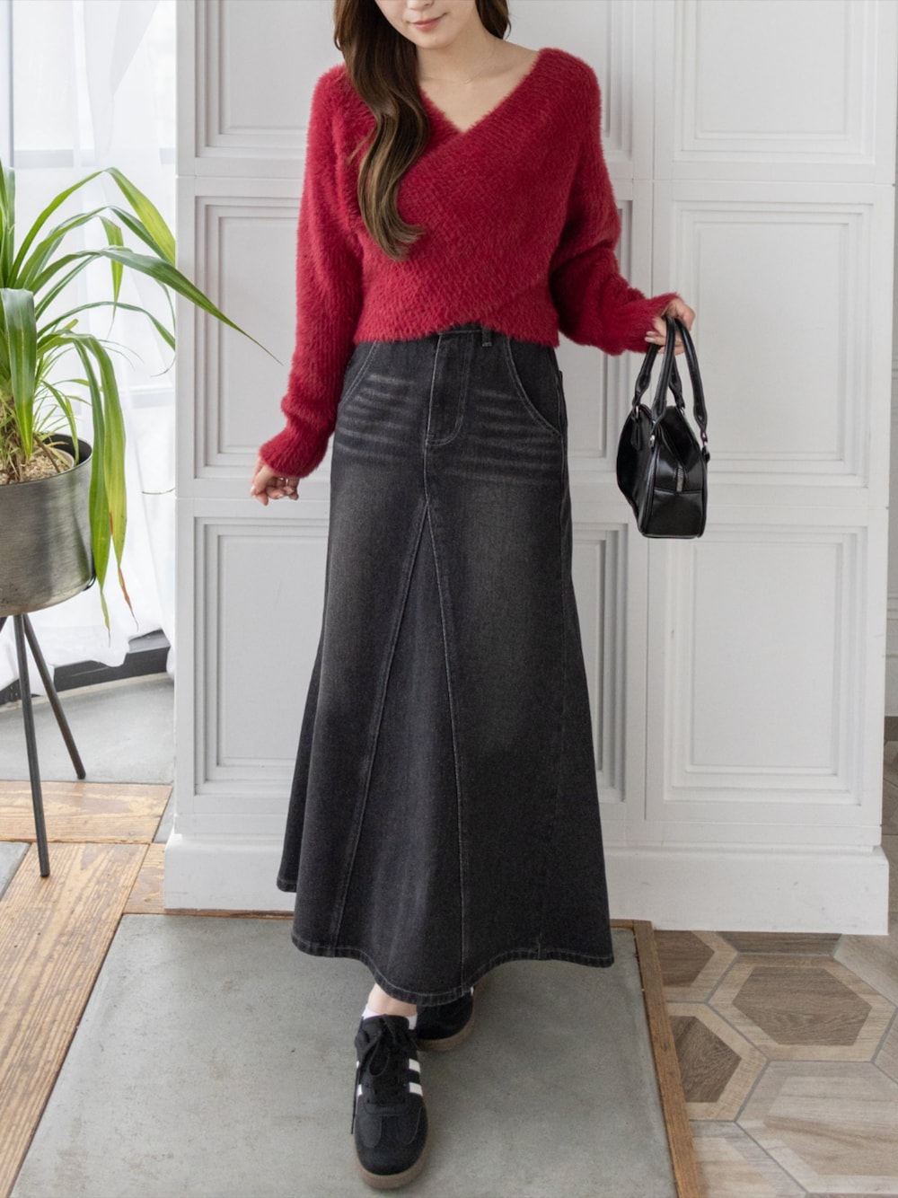 Vネックシャギーニット×デニムマーメイドスカートの 大人カジュアルコーデ