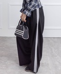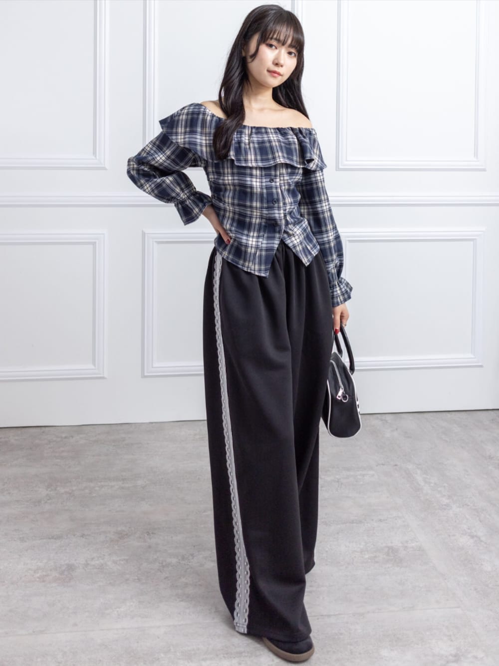 オフショルチェックブラウス×サイドレースパンツの甘辛モードコーデ