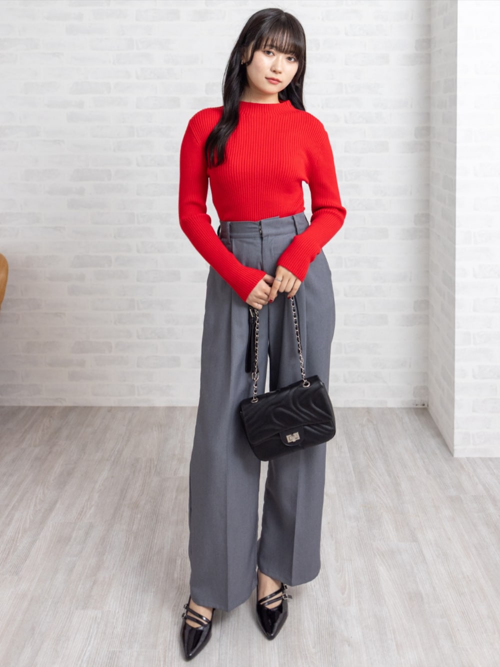 鮮やかなリブニットが映えるパンツコーデ