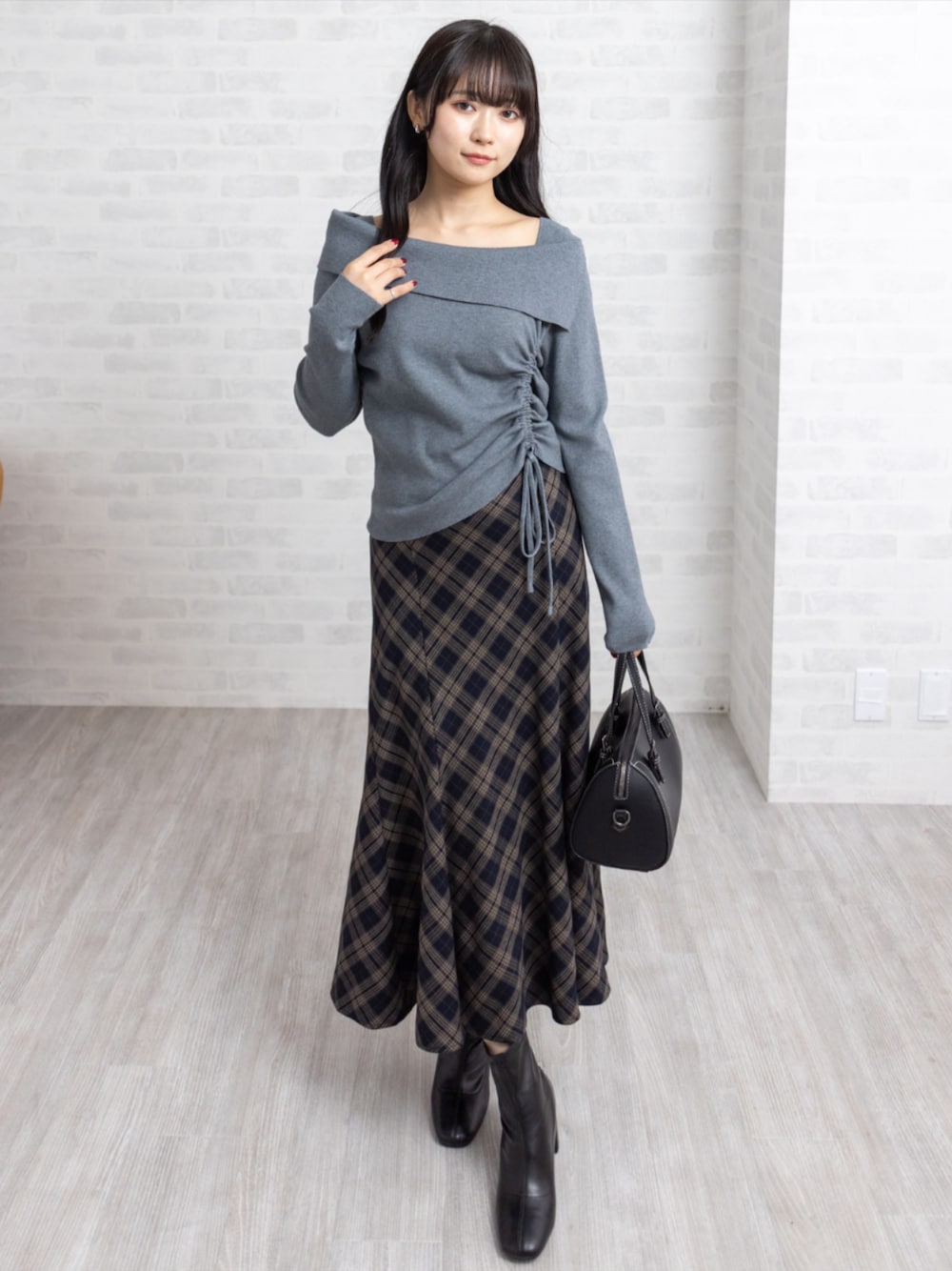 サイドシャーリングトップス×チェックマーメイドスカートで つくるフェミカジュアルコーデ