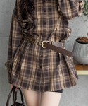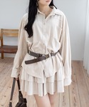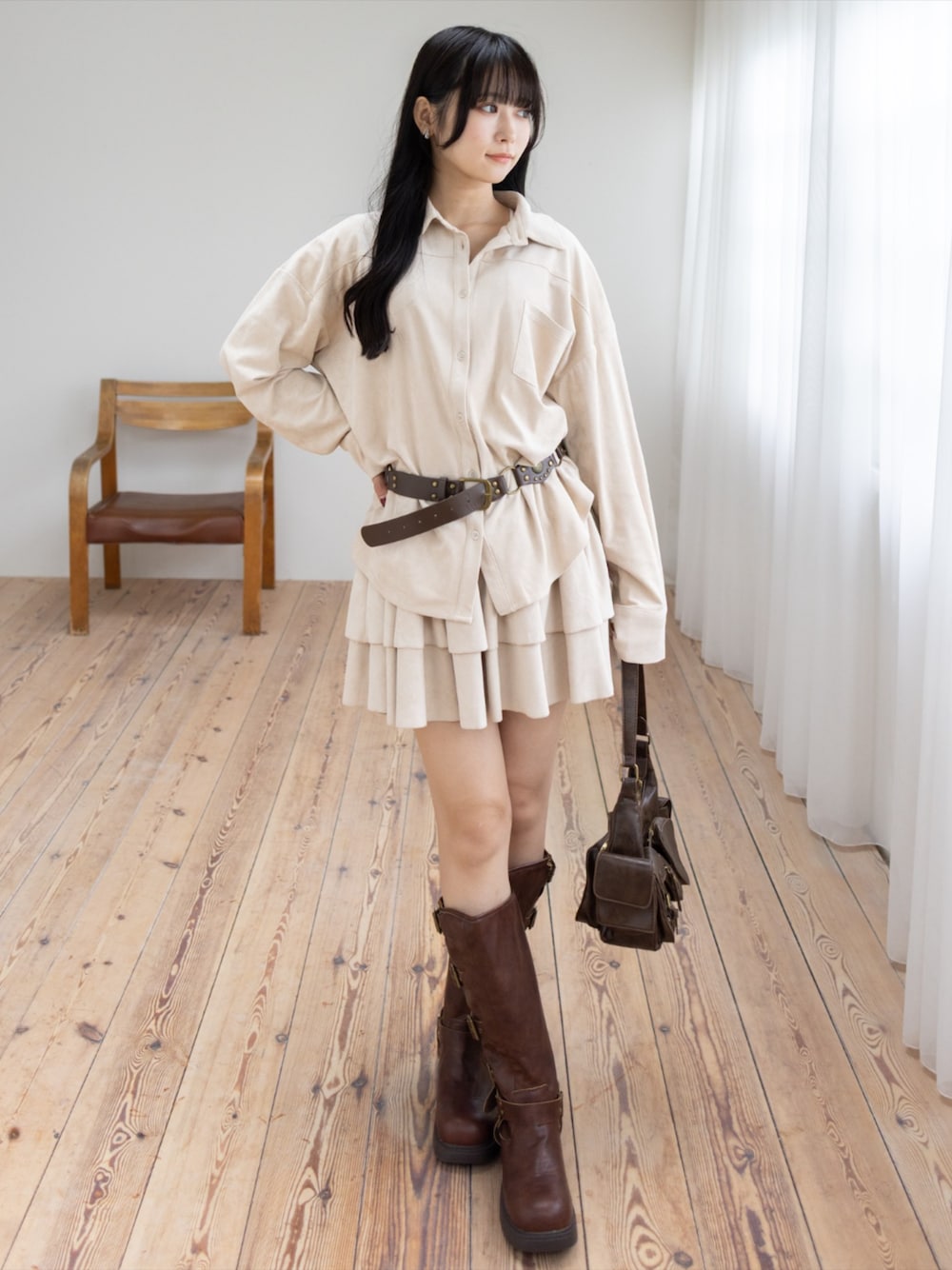 スエードシャツとティアードミニを合わせた ベルトアクセントのトレンドコーデ