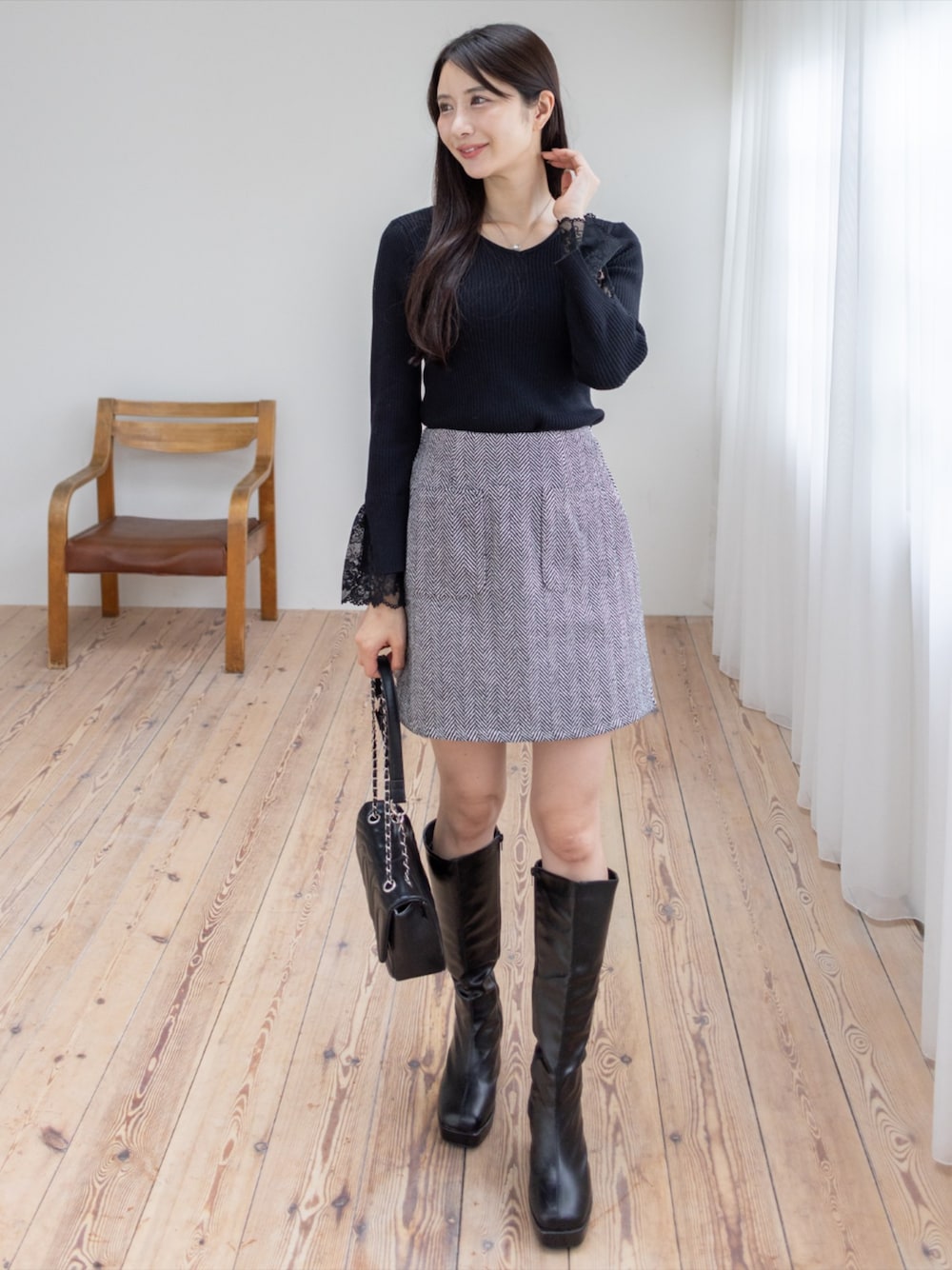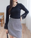 袖レースが映えるニットとツイードミニのきれいめフェミニンコーデ