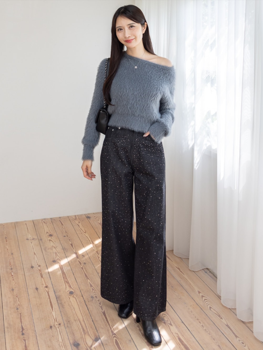 ふんわりシャギーニットとラインストーンデニムで 大人の抜け感を演出した冬のきれいめカジュアルコーデ