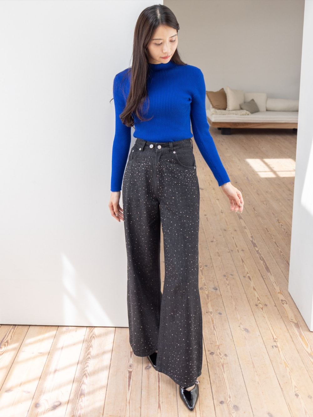 リブニットとラインストーンデニムで 大人モードにまとめた美シルエットコーデ
