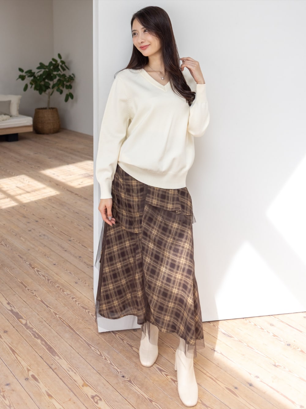 透け感のあるチェック柄スカートを主役にした やわらかフェミニンコーデ