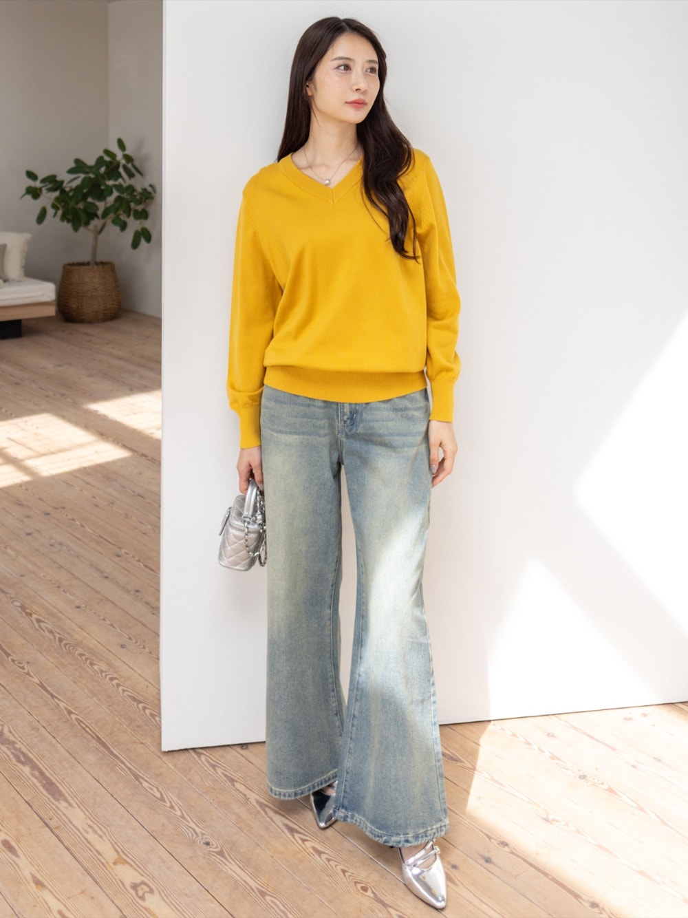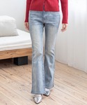 鮮やかなトップスとフレアデニムで大人カジュアルな抜け感コーデ