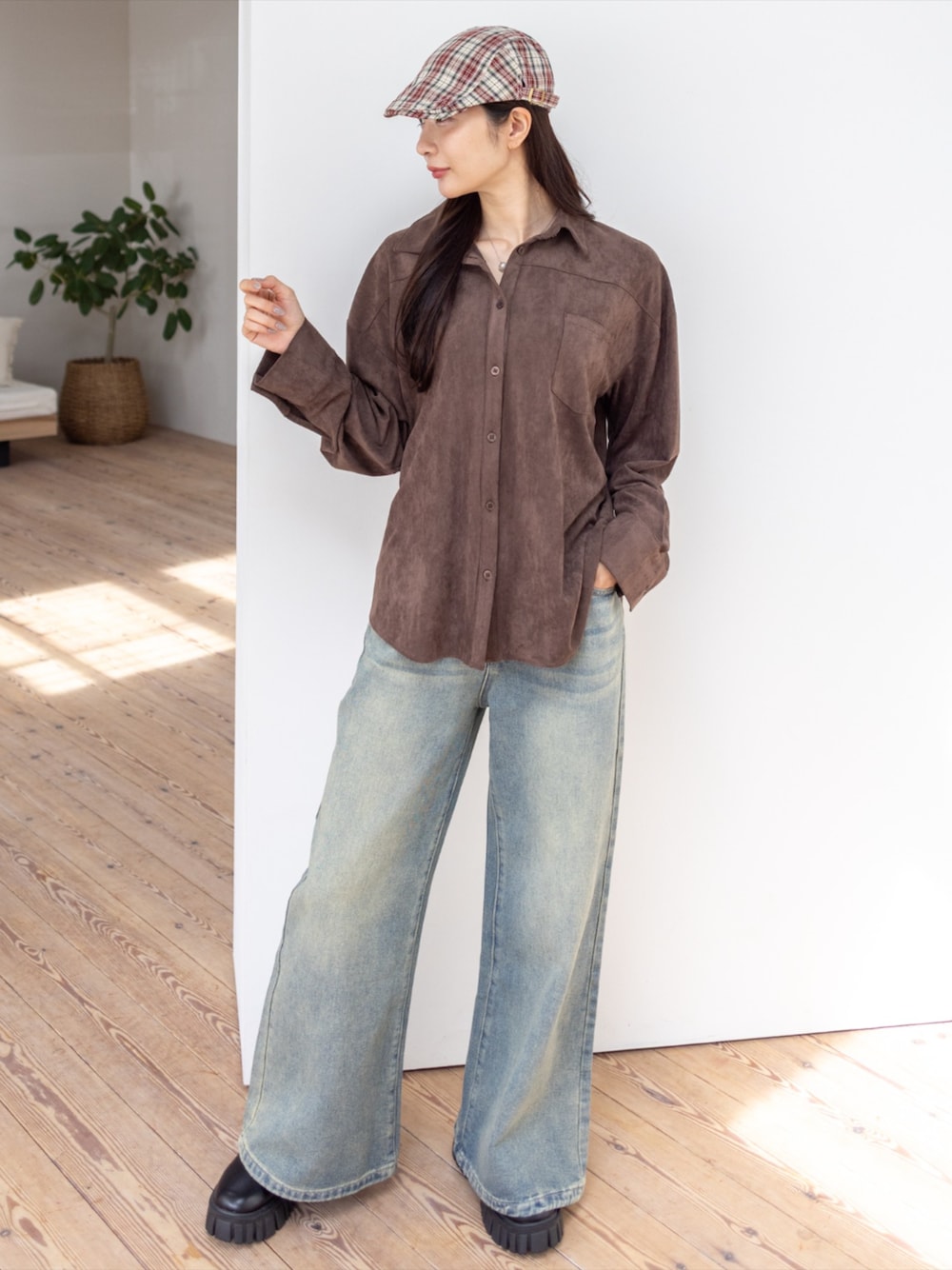 スエードシャツ×ワイドデニムで抜け感のある大人カジュアルスタイル