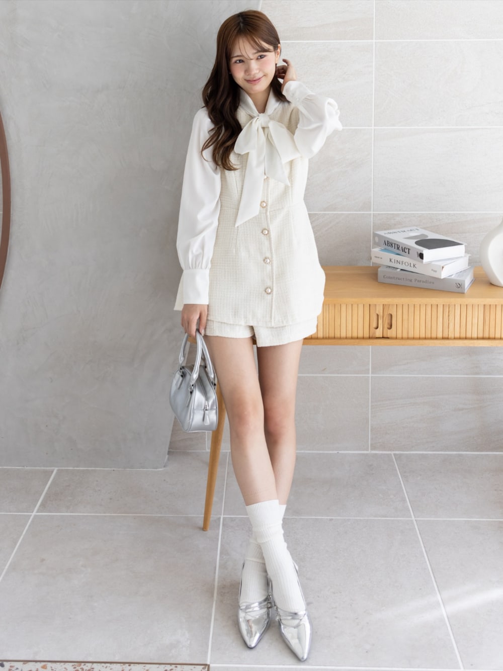 リボンブラウスにツイードベストとショートパンツを 合わせた上品ガーリーコーデ
