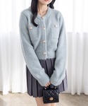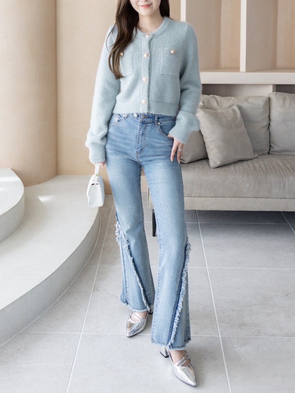 パールボタンカーデ×フリンジデニムで大人かわいいカジュアルコーデ