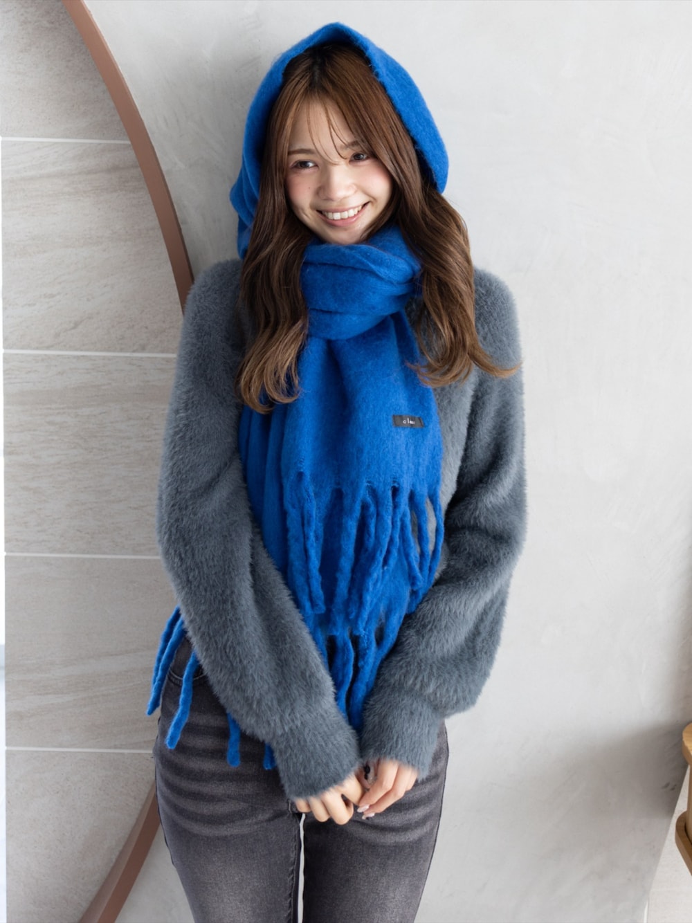 鮮やかなブルーのマフラーを主役にした 冬映えコーデで顔まわりをぱっと明るく魅せるスタイル