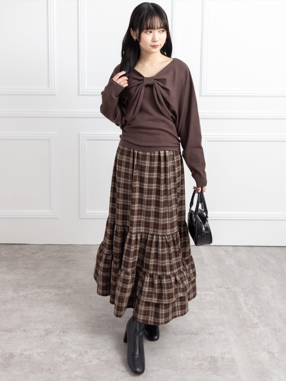 大きめリボンが目を惹くトップス チェックロングスカートで作る甘さ控えめな大人フェミニンコーデ