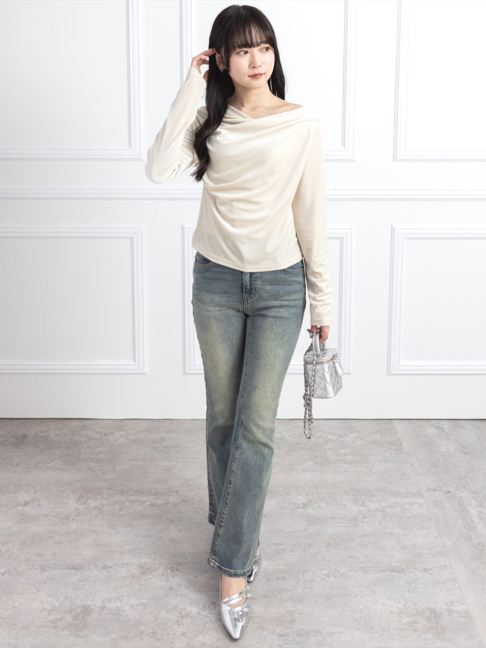 ドレープトップスにフレアデニムを合わせた 抜け感のある大人カジュアルコーデ