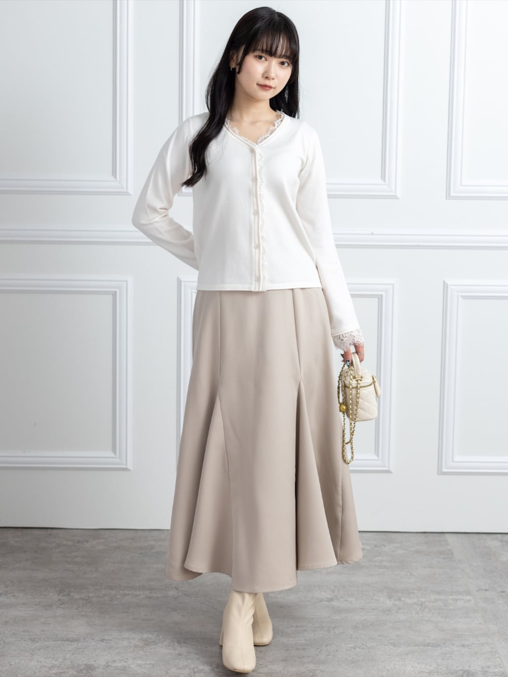 レース使いカーデとフレアスカートでつくる上品フェミニンコーデ