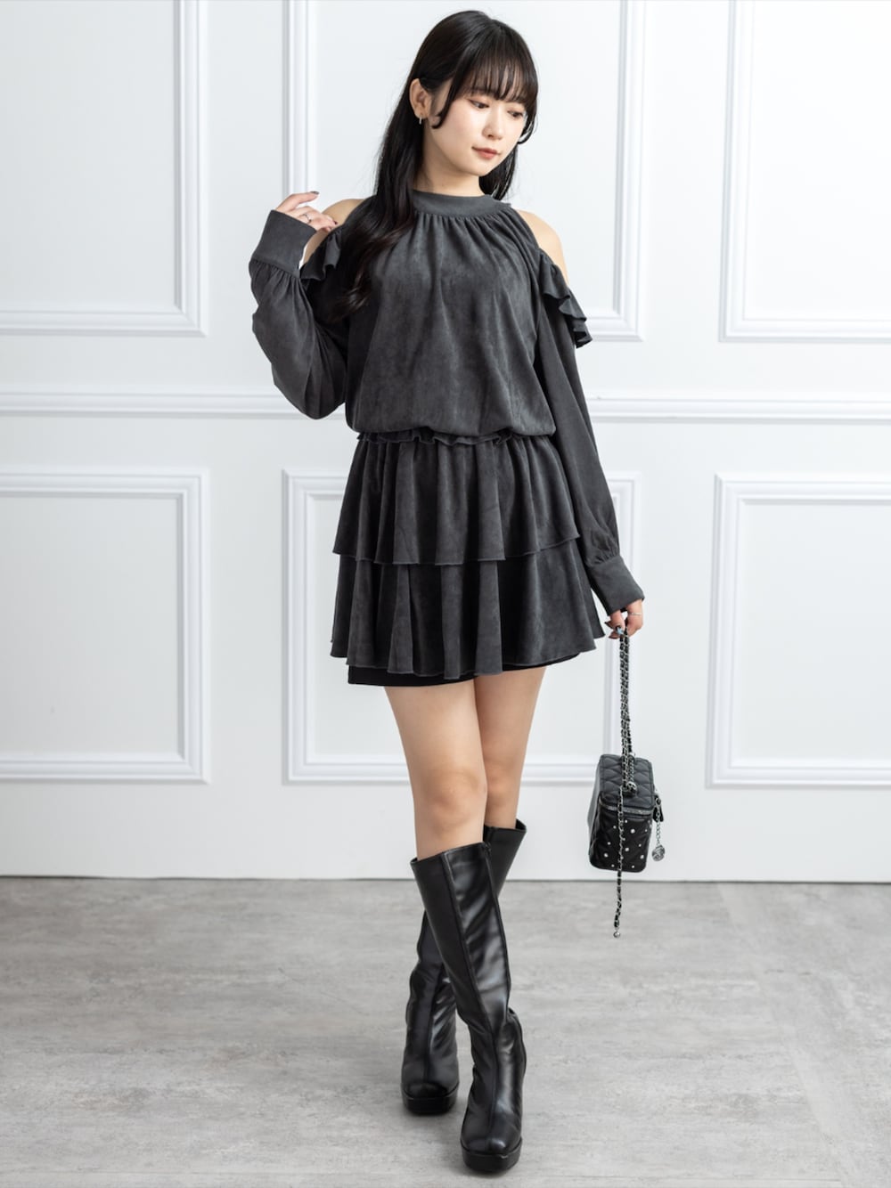 フリルミニワンピにロングブーツ合わせで 甘さと大人っぽさを両立したコーデです