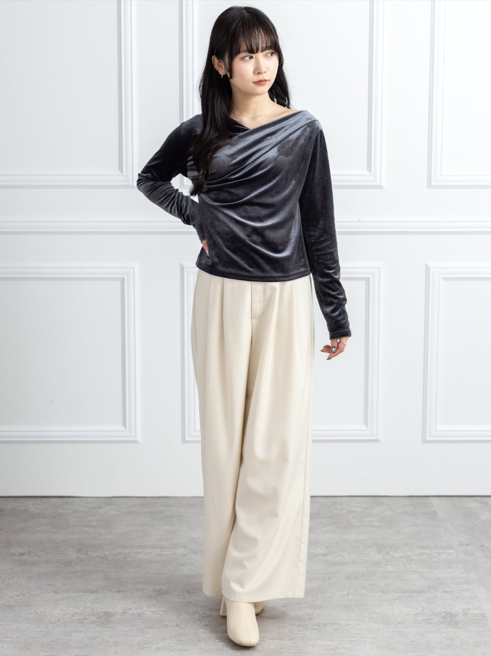 ドレープトップスを主役にワイドパンツで 大人っぽくまとめたコーデです