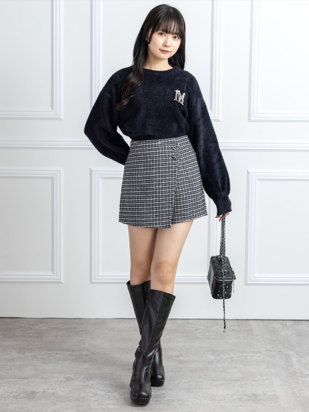 ふわふわニットにミニスカートを合わせて 大人可愛いバランスに仕上げたコーデです