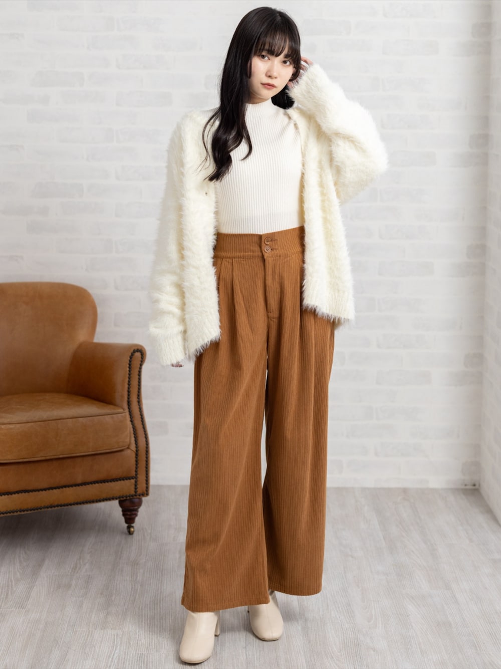 フェザーカーデにワイドパンツを合わせて 柔らかく大人っぽいコーデです