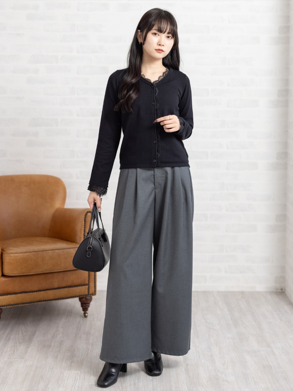 レース付きトップスにワイドパンツを合わせて 上品にまとめたコーデです
