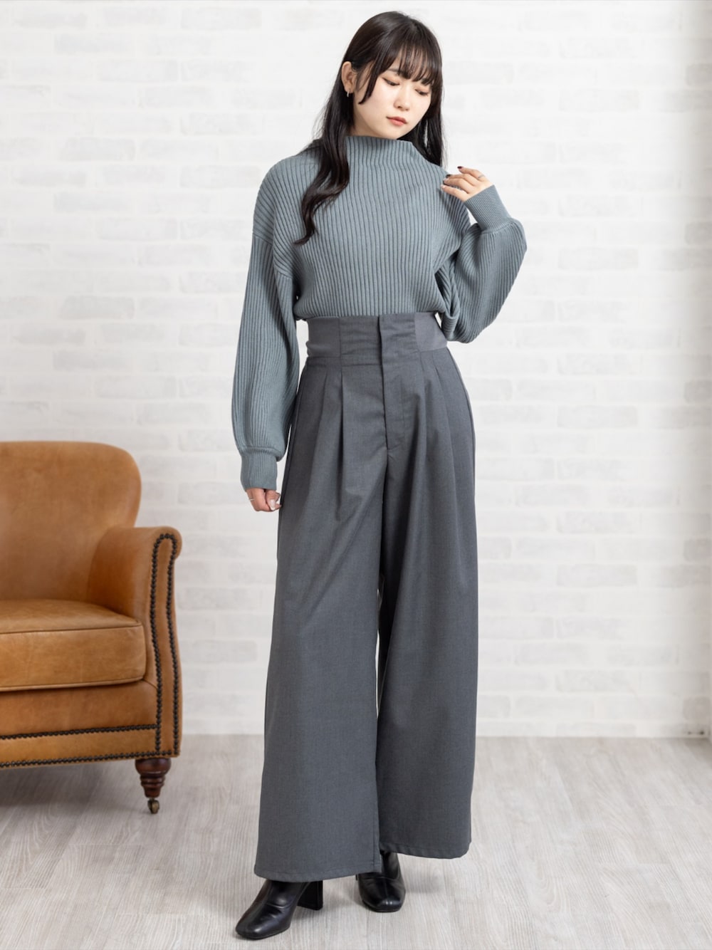 リブニットにワイドパンツを合わせて落ち着いた 大人カジュアルに仕上げたコーデです