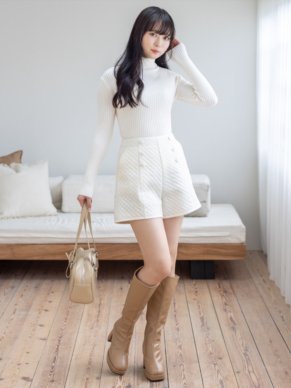 リブタートルにキルティングショートパンツを合わせて 大人ガーリーに仕上げたコーデです