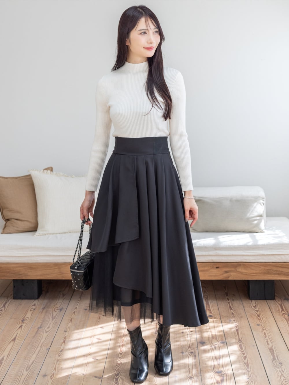 リブニットとフレアスカートでシンプルながら 女性らしくまとめたコーデです