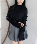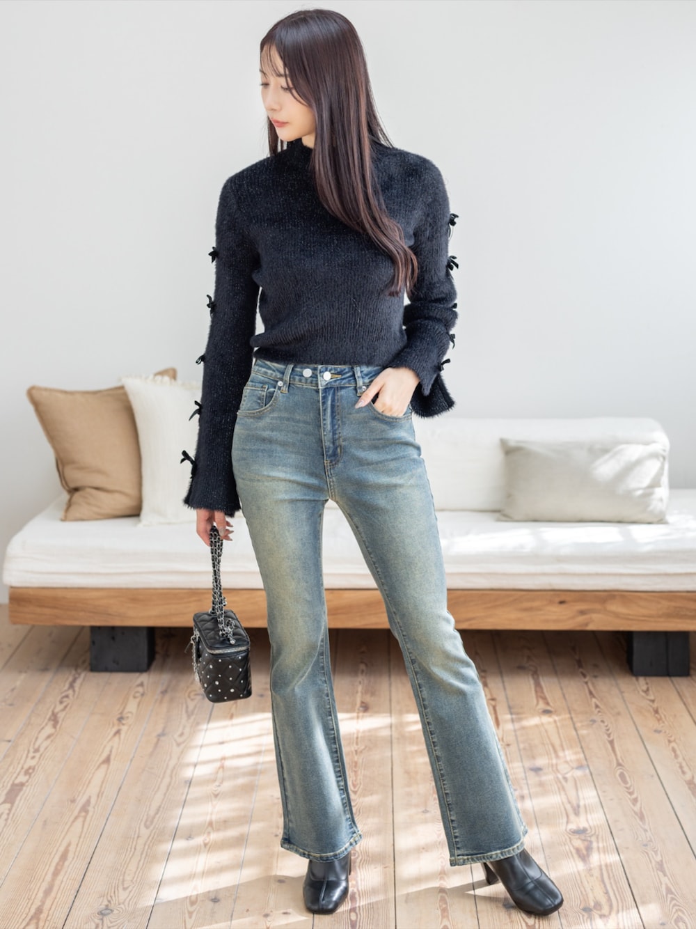 リボンディテールが効いたニットにデニムを合わせ 甘さとクールさをバランスよくミックスしたコーデです