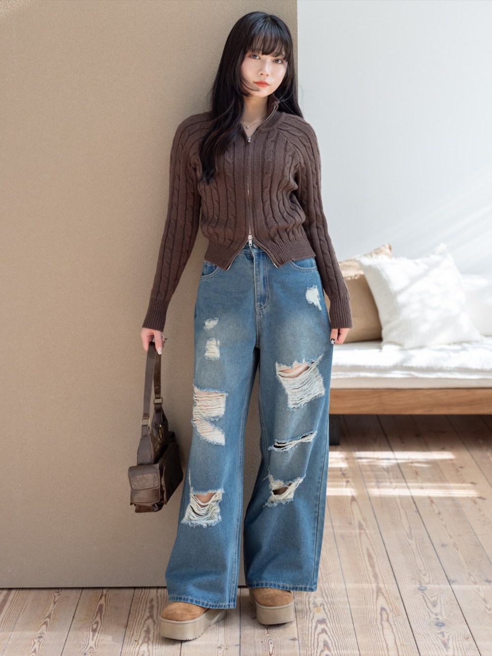 ジップニットにダメージデニムを合わせたラフカジュアルコーデ