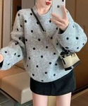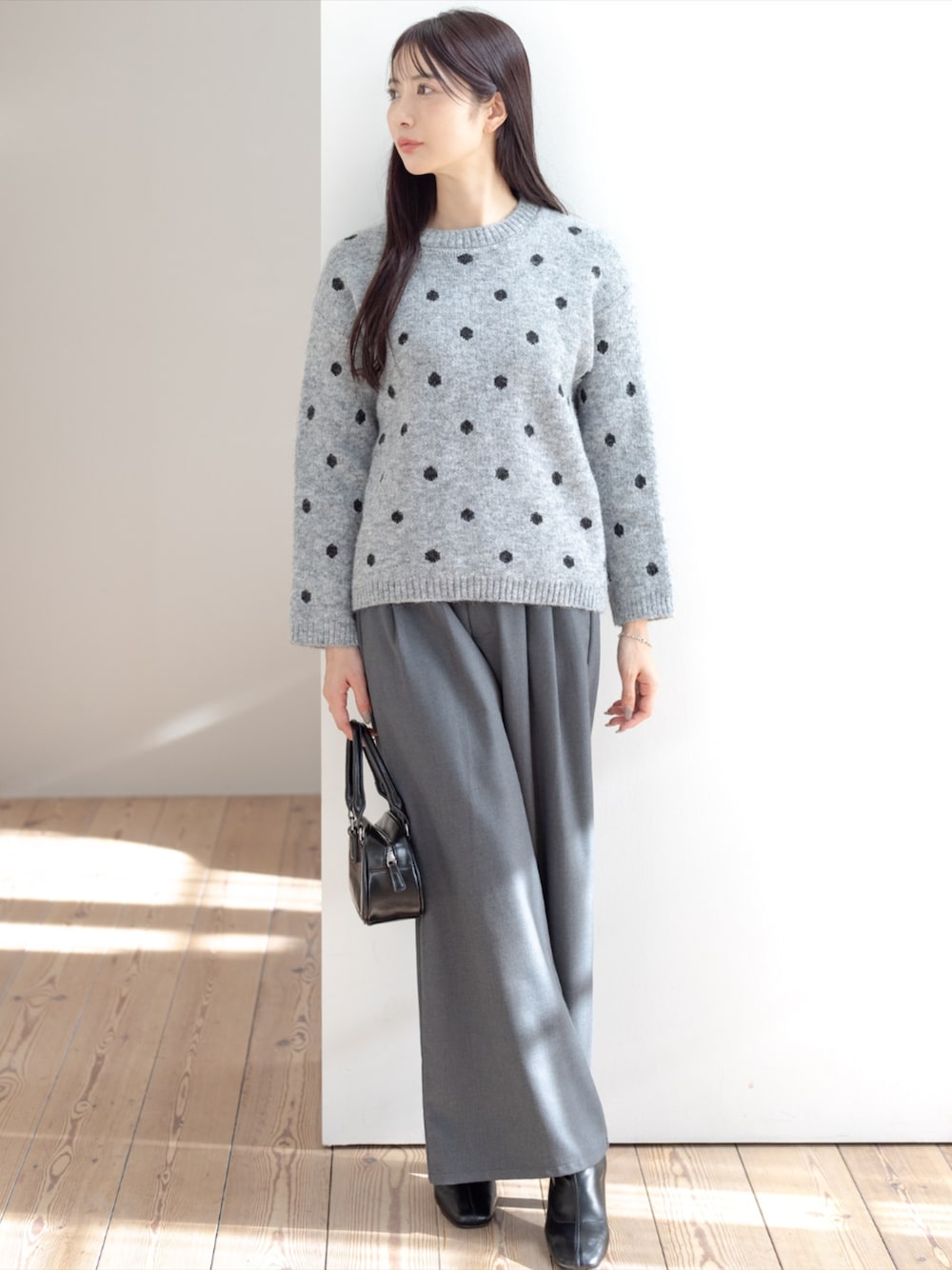 ドットニットにワイドパンツを合わせた大人カジュアルコーデです