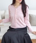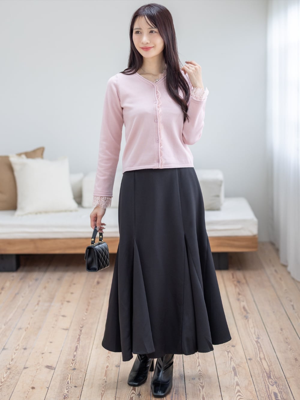 やさしいピンクのカーディガンにフレアスカートを合わせて 上品で女性らしい印象に仕上げています