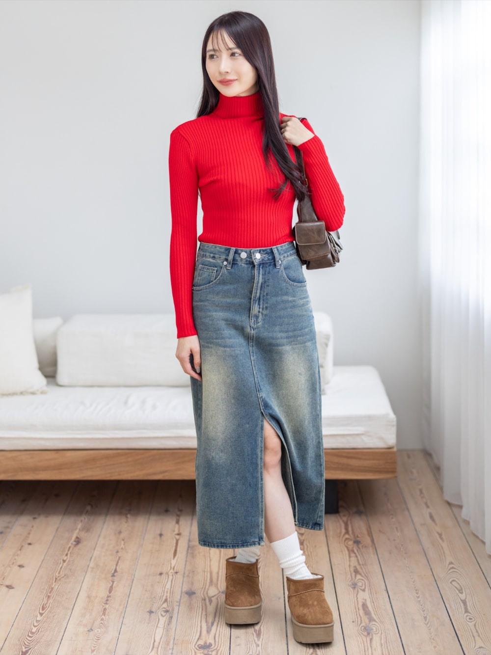 差し色の赤ニットが映えるデニムスカートで 大人カジュアルにまとめました♪