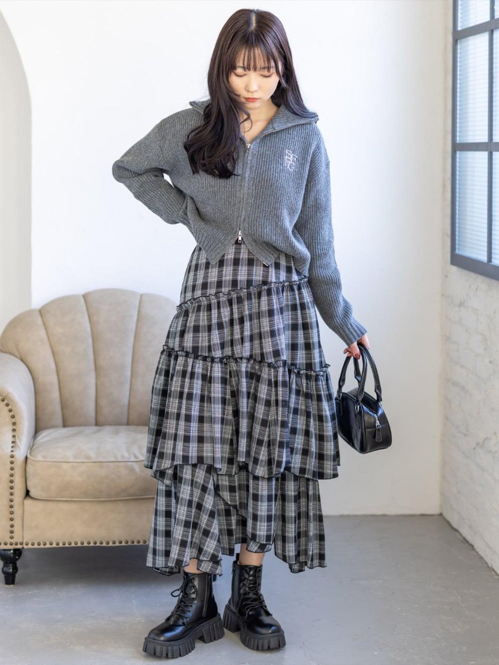 ジップニットで程よく力を抜いた チェックティアードの大人カジュアルコーデ