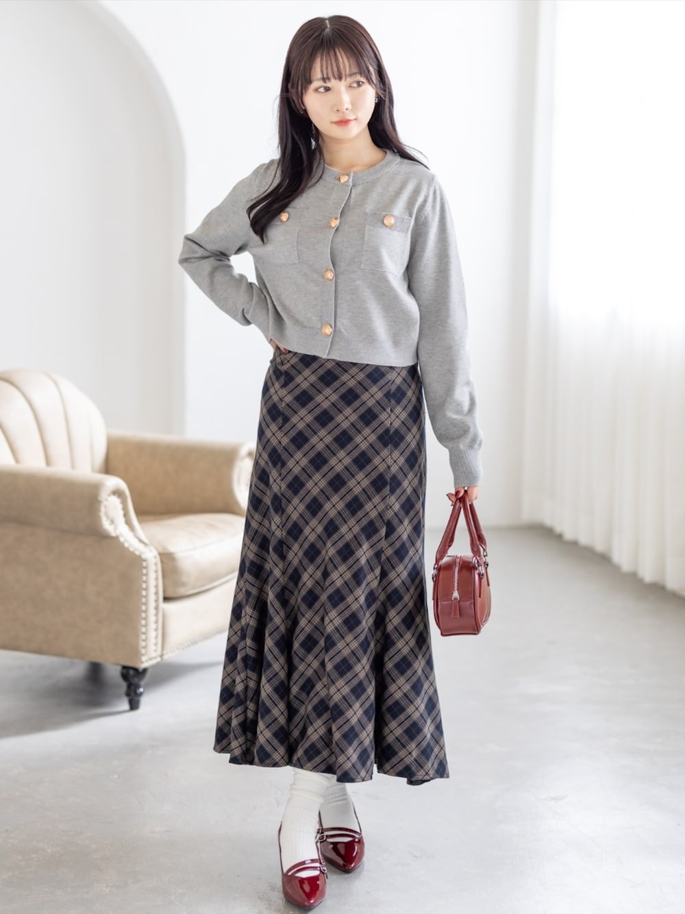 チェック柄スカートが主役のきれいめフェミニンコーデ