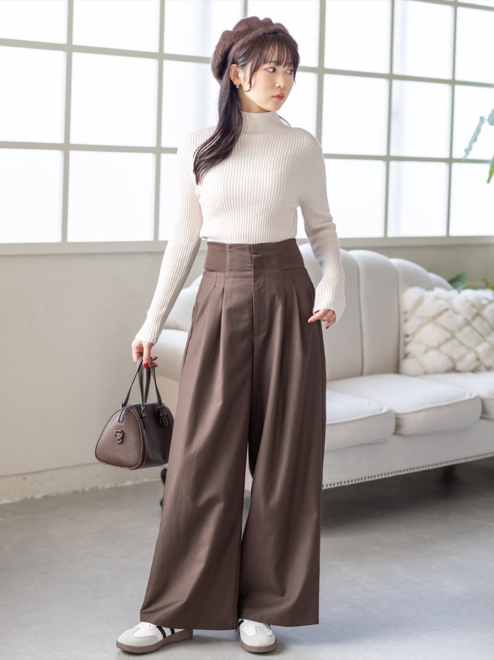 すっきりリブトップスにワイドパンツを合わせた 大人きれいめスタイル
