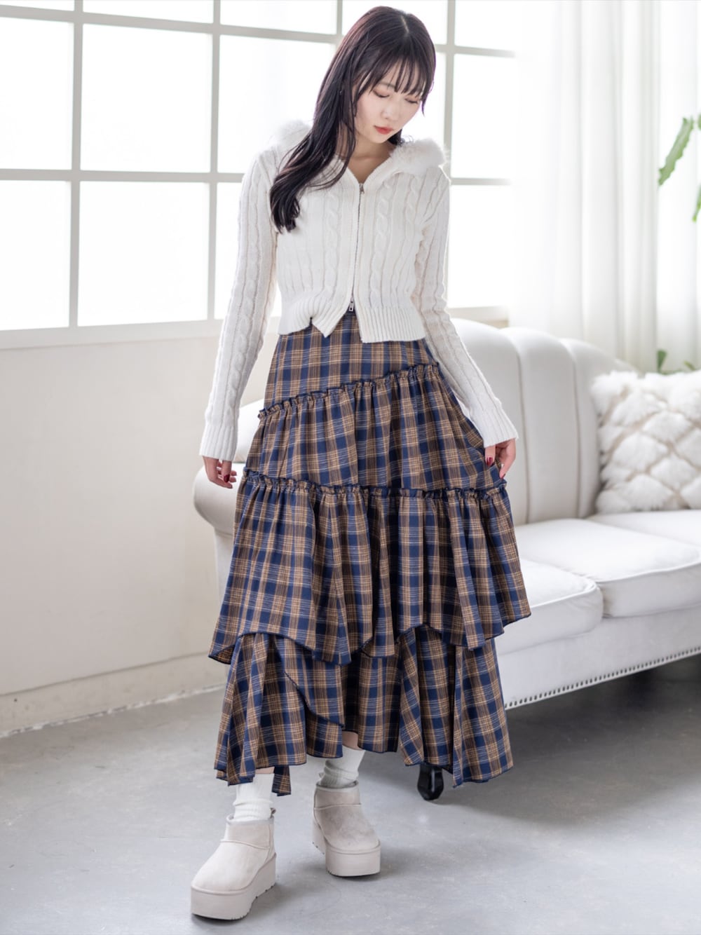 ケーブルニットとチェックティアードで やさしくまとめたガーリーフェミニンコーデ