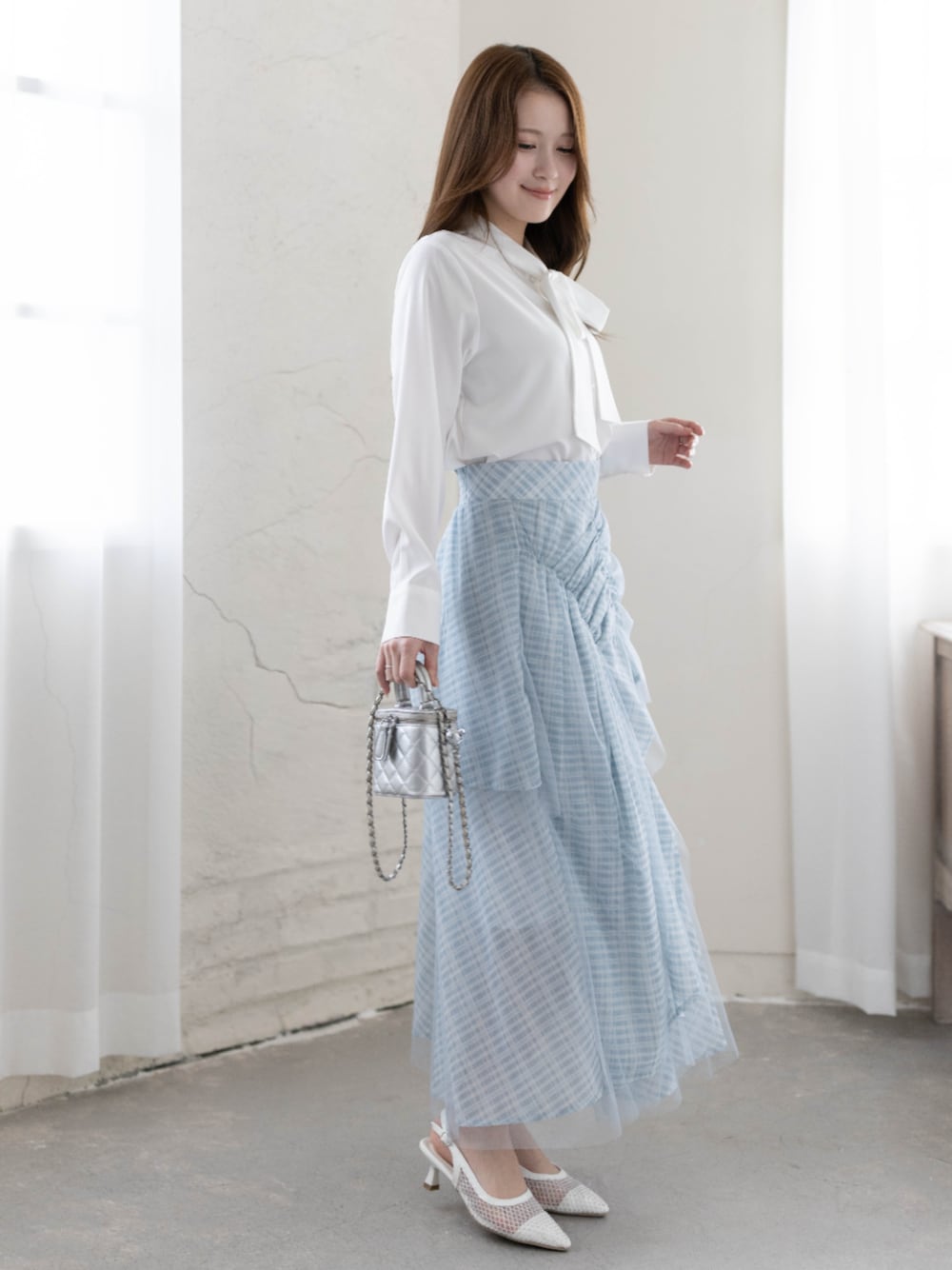 爽やかな水色チェックが主役の春コーデ🦢 ボウタイブラウスを合わせて、顔まわりを華やかに、清楚な印象に仕上げました。 スカートはチュールが重なったデザインで、歩くたびにエアリーな揺れ感が出てとても可愛いです✨ 小物はシルバーのチェーンバッグを合わせて、涼しげなアクセントをプラス。 初デートや、ちょっとしたお食事会にもぴったりなスタイルです!