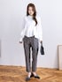 シンプルだけど地味にならない、大人のモノトーンスタイル🤍🖤 ブラウスのフリルデザインと、パンツのドット柄でフェミニンさもプラス。 パンツはグレーベースなので、黒よりも柔らかい印象になって春にぴったり🌸 足元はエナメルのストラップパンプスでツヤ感を足して、レディな雰囲気にまとめました👠