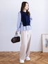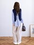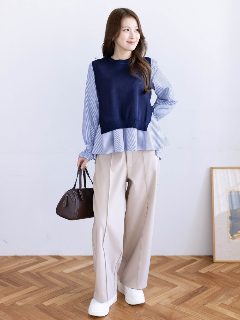 ベストとストライプシャツを重ね着したような、レイヤード風トップスが主役。 きちんと感のあるシャツスタイルですが、あえて足元に白スニーカーを合わせてカジュアルダウン✨ ボトムスはベージュのワイドパンツでリラックス感をプラス。 「ブルー×ネイビー×ベージュ」の配色は、清潔感があって誰からも好印象な鉄板カラーです🌿