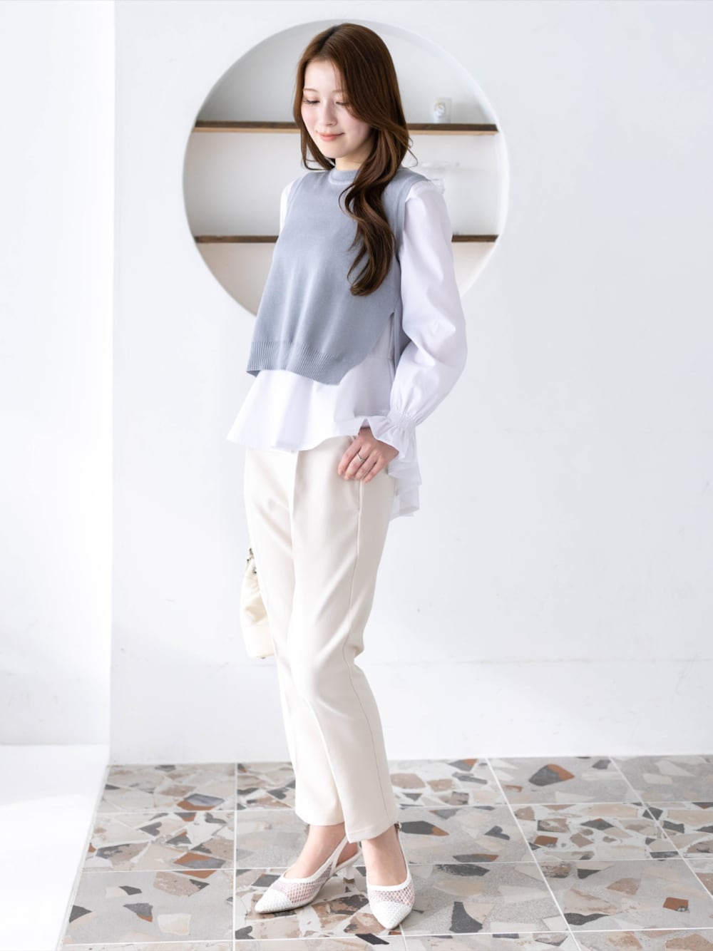 淡いグレーのベストとのレイヤードトップスが主役。 ホワイトのパンツと合わせることで、全体がパッと明るく爽やかな印象になります☁️ 足元はメッシュ素材のパンプスで抜け感をプラス。 デートやランチに着ていきたい、春のお出かけコーデです🌷