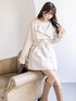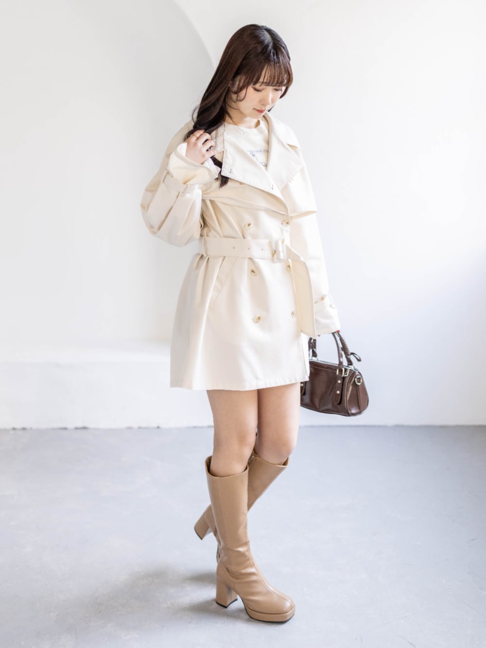 春アウターの主役、ミディ丈トレンチコート。 ボタンを全部閉めてベルトでウエストマークすれば、ミニワンピースみたいなシルエットになって可愛い♡ 前を開ければ、中のロゴニットとミニスカートが見えてカジュアルな雰囲気に早変わりします。 気分に合わせて着こなしを変えられるのが嬉しいポイントです✨