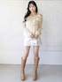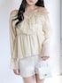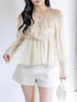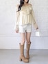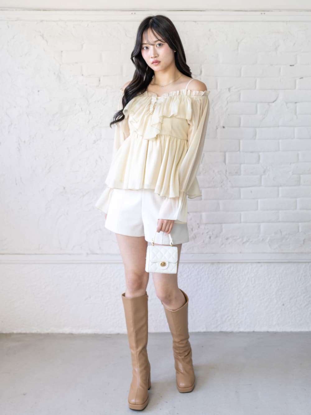 デコルテラインが綺麗に見える、シフォン素材のオフショルダーブラウスが主役! たっぷりのフリルと透け感が、女の子らしさを最大限に引き出してくれる「あざと可愛い」アイテムです🥺✨ ボトムスはホワイトのショートパンツですっきりと。 ベージュのロングブーツを合わせて露出のバランスを調整すれば、彼ウケも抜群な春のデートコーデの完成です🤍